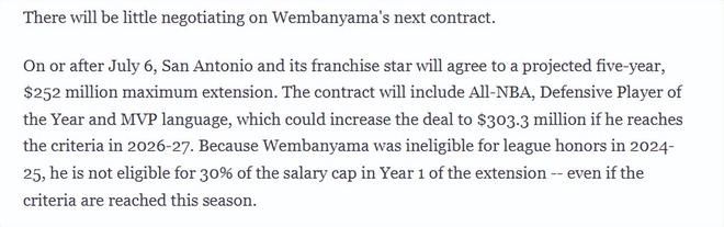 由于文班亞馬在2024-25賽季沒(méi)有資格參評(píng)聯(lián)盟獎(jiǎng)項(xiàng),即便本賽季達(dá)標(biāo),他續(xù)約第一年的薪資也無(wú)法占到工資帽的30%。