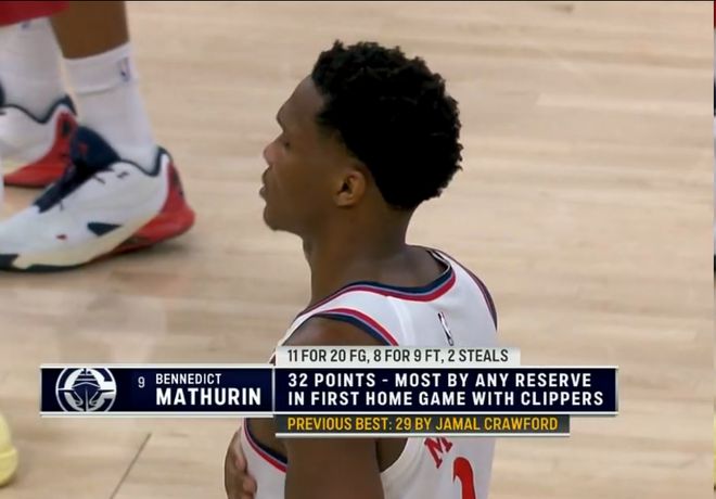 要知道,馬瑟林本場比賽轟下的38分(圖片中的32分是比賽還未結(jié)束時轉(zhuǎn)播方給出的數(shù)據(jù))是快船隊(duì)史在主場首秀得分最多的,超過了賈馬爾-克勞福德的29分。