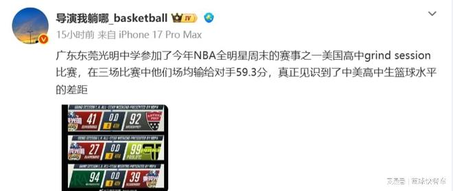 近日,由于NBA全明星周末延伸出來(lái)的美國(guó)高中g(shù)rind session比賽,作為中國(guó)隊(duì)代表,廣東東莞光明中學(xué)參加了這一次比賽。不過(guò),非常遺憾的是,在這一次比賽中,他們慘遭三連敗,三場(chǎng)比賽場(chǎng)均狂輸59.3分,完全被對(duì)手摁在地板上狂揍,毫無(wú)還手之力。從這三場(chǎng)比賽可以看出來(lái),中國(guó)高中生與美國(guó)高中生的差距究竟有多大。這也是中國(guó)男籃近幾年低迷的一大縮影。而這三場(chǎng)潰敗,也給予了中國(guó)男籃重拳一擊。