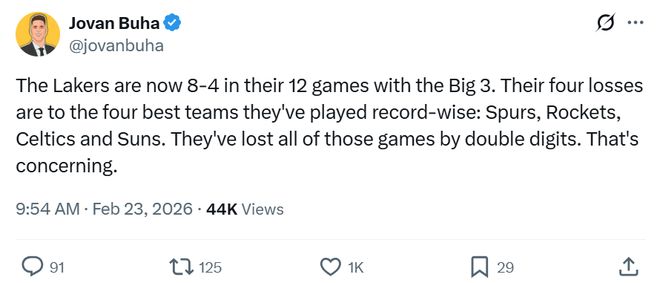 湖人媒體PurpGolded更是發(fā)文失望表示:“湖人這樣的表現(xiàn)很難突破首輪?!?/p>