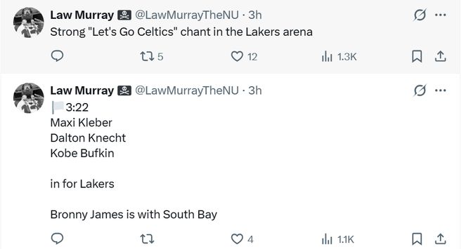 賽后記者Law Murray曝出,在比賽失去懸念后,湖人主場響起了“凱爾特人加油”的呼聲以表達(dá)對主隊(duì)表現(xiàn)的不滿。