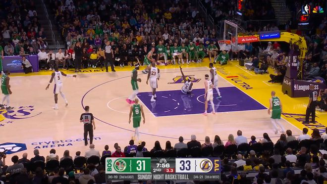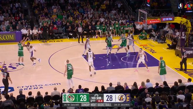 ——第二節(jié)開(kāi)局1分半,進(jìn)攻時(shí)間快耗盡前,單挑八村壘,背運(yùn)后撤步,腳踩湖人LOGO的大號(hào)三分