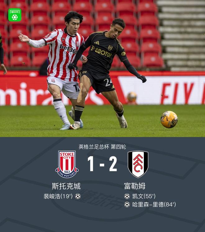 北京時間2月15日英格蘭足總杯第四輪,斯托克城對陣富勒姆。斯托克城裴峻浩破門。富勒姆凱文、哈里森-里德分別破門。最終富勒姆客場2-1逆轉(zhuǎn)斯托克城晉級。