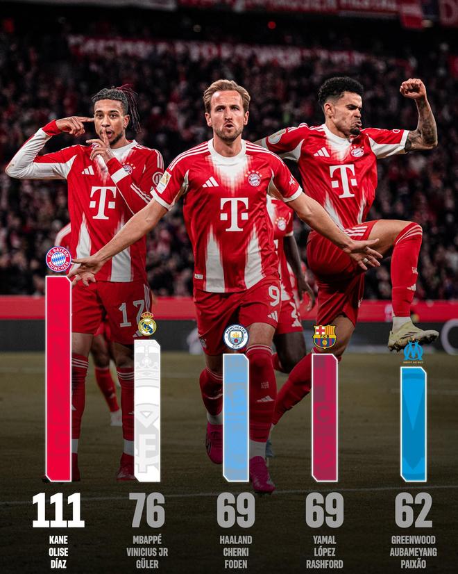本賽季至今,哈里-凱恩、奧利塞以及路易斯-迪亞斯合計直接參與的進球數(shù)已經(jīng)高達111球,同期這一數(shù)據(jù)位列全歐第一,比排名第二的皇馬三叉戟姆巴佩、維尼修斯和居萊爾多出了35球。