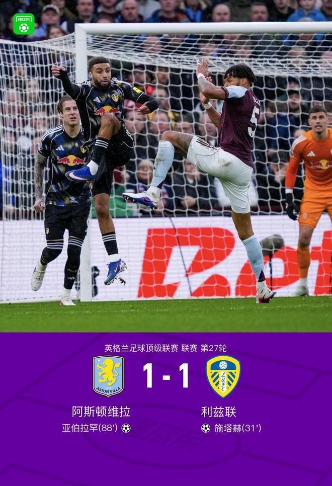 北京時(shí)間2月21日英格蘭足球頂級聯(lián)賽第27輪,阿斯頓維拉主場對陣?yán)澛?lián)。施塔赫任意球率先破門,亞伯拉罕比賽尾聲扳平。最終比分阿斯頓維拉1-1利茲聯(lián)。