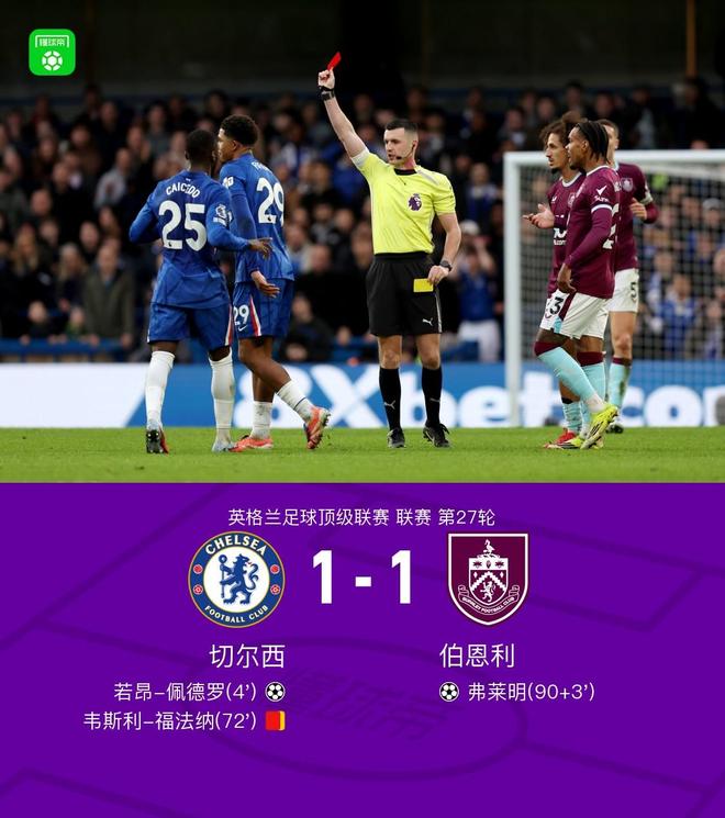 北京時間2月21日23:00,英超第27輪展開爭奪,切爾西坐鎮(zhèn)斯坦福橋球場迎戰(zhàn)伯恩利,本場主裁判為劉易斯-史密斯。上半場,內(nèi)托助攻若昂-佩德羅閃擊,帕爾默失良機(jī)。下半場,韋斯利-福法納踩人犯規(guī)吃到第二張黃牌被罰下,弗萊明補(bǔ)時階段頭槌絕平。最終,十人切爾西1-1伯恩利。