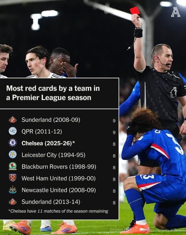 根據(jù)The Athletic統(tǒng)計,切爾西本賽季英超已經(jīng)吃到8張紅牌,在英超球隊單賽季紅牌榜上排名第三。