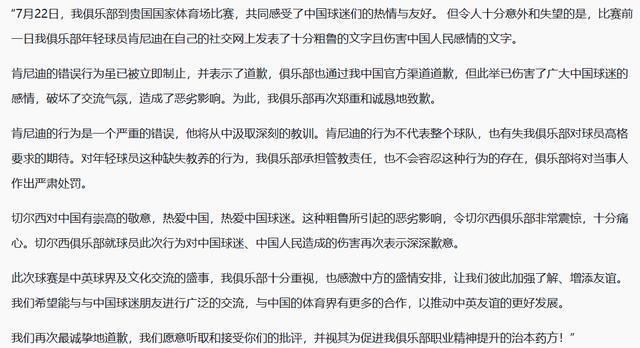 「切爾西對(duì)中國(guó)有崇高的敬意,熱愛(ài)中國(guó),熱愛(ài)中國(guó)球迷。這種粗魯所引起的惡劣影響,令切爾西俱樂(lè)部非常震驚,十分痛心。切爾西俱樂(lè)部就球員此次行為對(duì)中國(guó)球迷、中國(guó)人民造成的傷害再次表示深深歉意。」