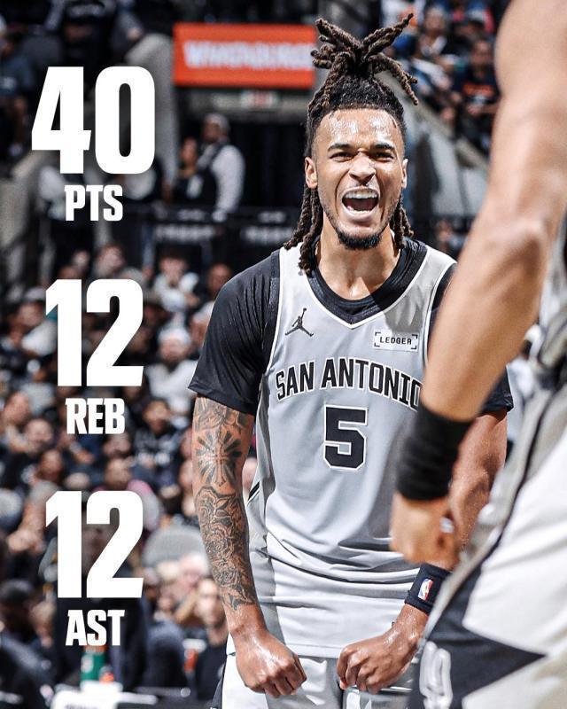 40分12板12助攻,馬刺隊卡斯?fàn)柨诚職v史性的40分三雙,夢想成真