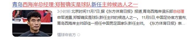 而就在剛剛,《東方體育日?qǐng)?bào)》發(fā)布獨(dú)家消息,經(jīng)青島西海岸總經(jīng)理申軍證實(shí),外界傳言的鄭智確實(shí)是球隊(duì)主帥候選人之一,所以不出意外的話,鄭智下賽季將會(huì)接替邵佳一出任青島西海岸主帥。