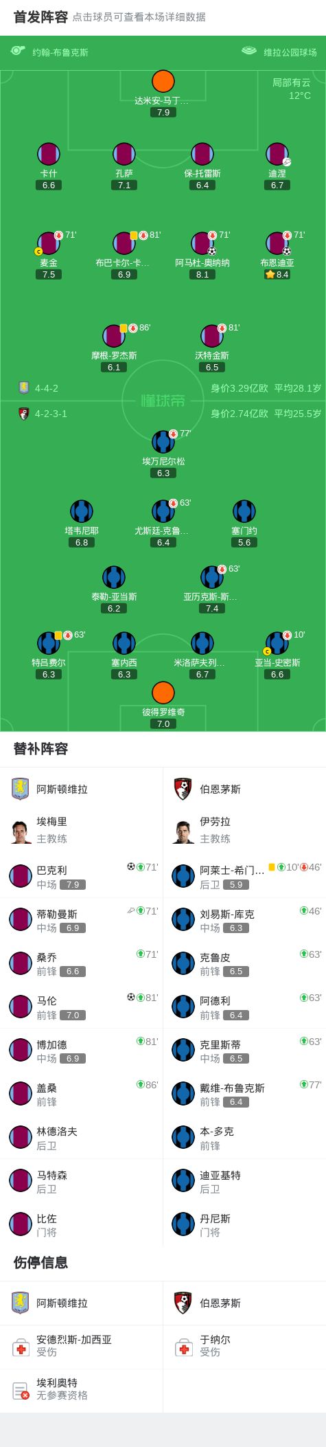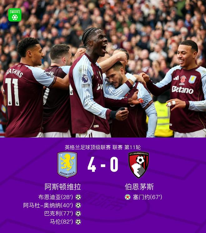 北京時間11月9日22:00,英超第11輪,阿斯頓維拉坐鎮(zhèn)主場迎戰(zhàn)伯恩茅斯。比賽中,布恩迪亞任意球破門,隨后阿馬杜-奧納納遠射再下一城;下半場,塞門約主罰點球被大馬丁撲出,巴克利、馬倫先后取得進球。最終,阿斯頓維拉以4-0戰(zhàn)勝伯恩茅斯。