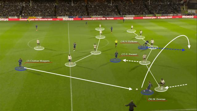 與此同時,中場球員地面直塞或長距離過頂、薩卡在右路插上,是另一個常見套路。相對來說,連續(xù)復(fù)雜傳切配合后送出致命直塞,就少見得多,畢竟對方此時早已在禁區(qū)內(nèi)外扎緊籬笆——早有大量事實證明,老派傳控型球隊把對手摁在禁區(qū),然后從左傳到右,從右傳到左,大多數(shù)時候都是自己給自己上難度的絕望踢法。