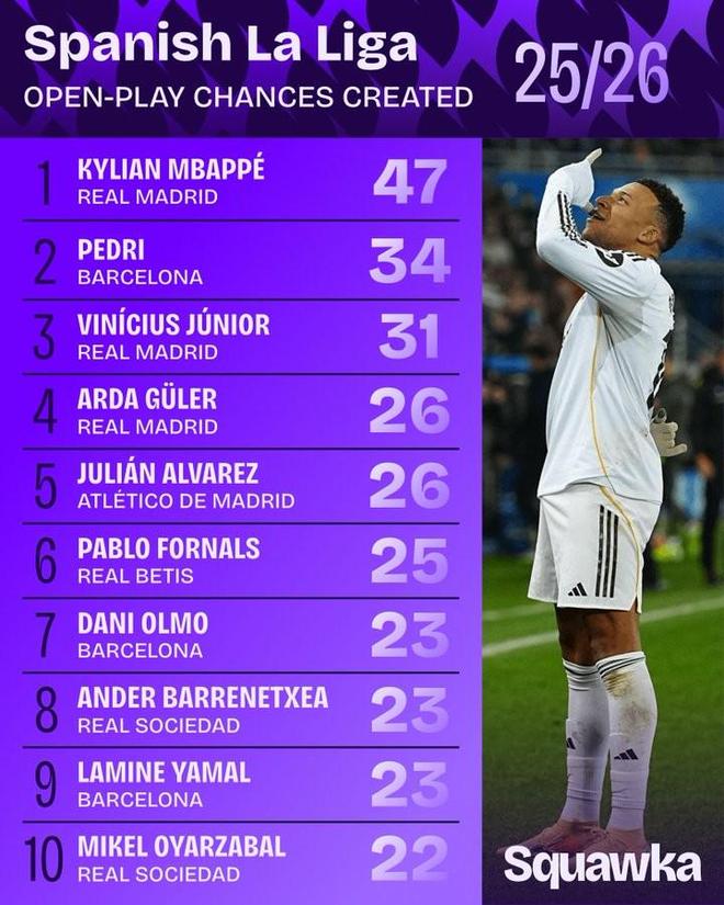 根據(jù)統(tǒng)計,本賽季到目前為止,姆巴佩是西甲當(dāng)中運動戰(zhàn)創(chuàng)造機會最多的球員,佩德里位居第二,維尼修斯位居第三。