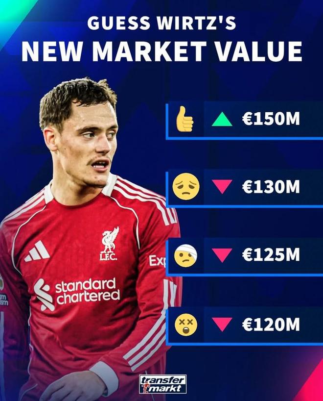 10月17日德轉(zhuǎn)就將更新英超球員的身價(jià),對(duì)此他們給目前身價(jià)1.4億歐元的維爾茨做了預(yù)熱,并且給出了四個(gè)身價(jià)選項(xiàng),分別是上漲至1.5億歐元、下跌至1.3億歐元、下跌至1.25億歐元以及下跌至1.2億歐元。
