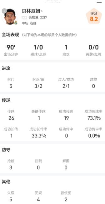 貝林厄姆有著26次傳球,其中19次成功,包括1次關(guān)鍵傳球,傳球成功率達到73.1%;貝林厄姆還有著1次成功長傳,長傳成功率為33.3%。